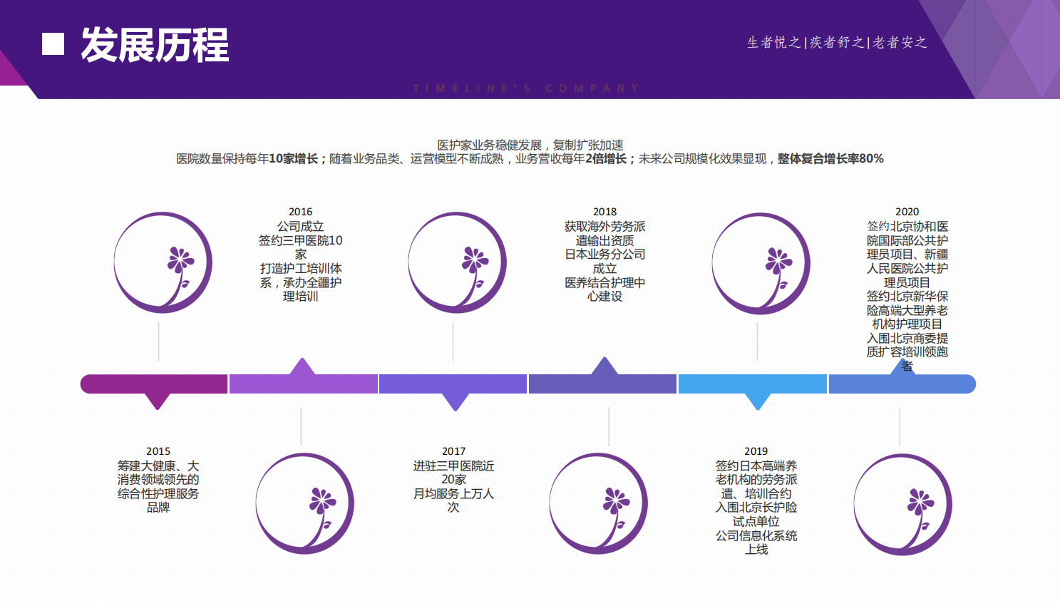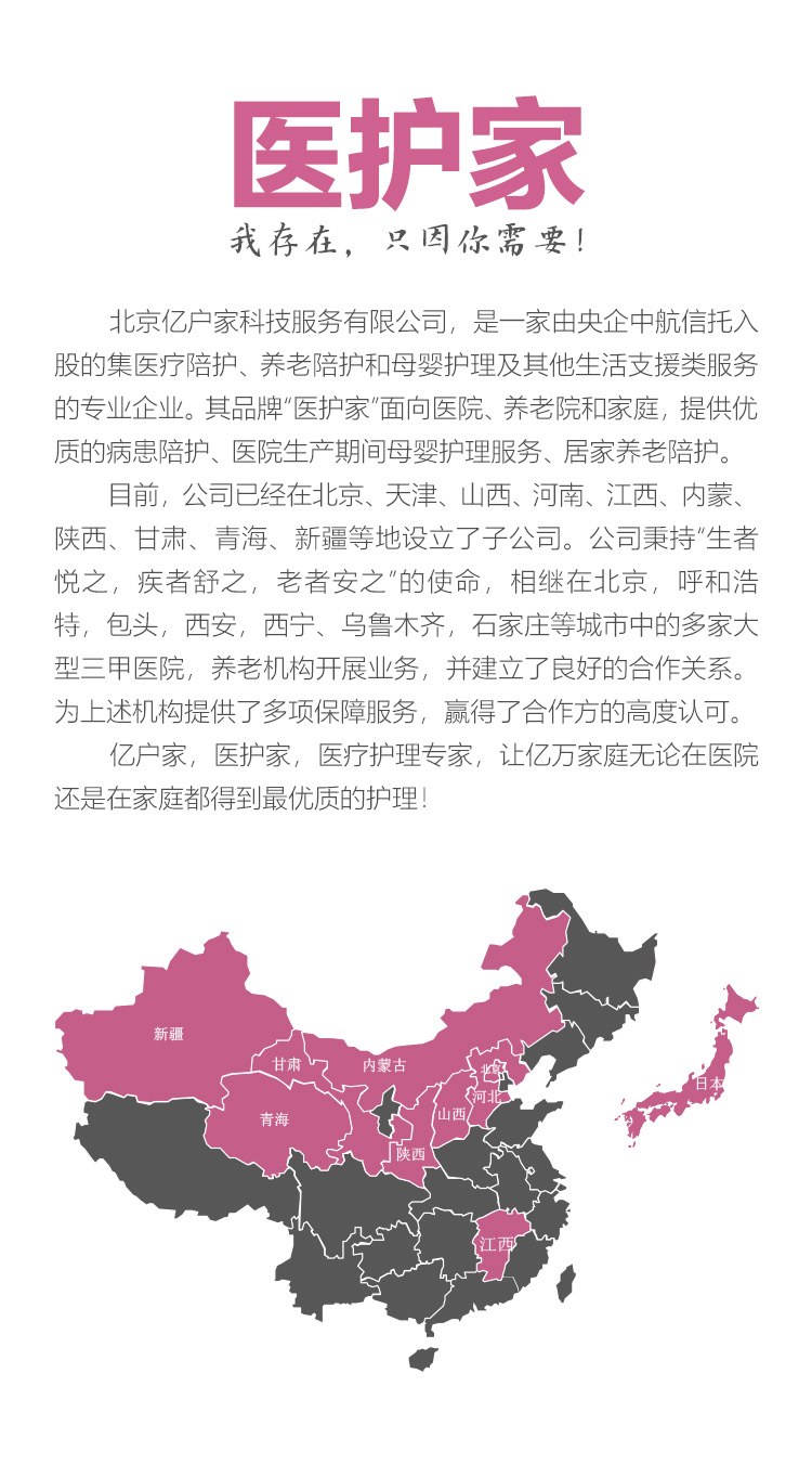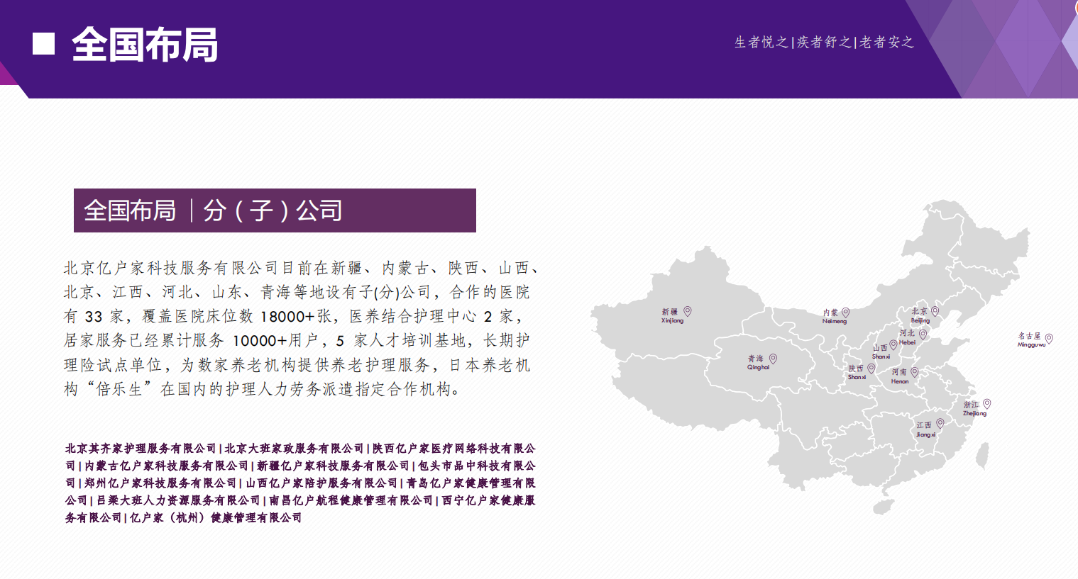 北京億戶(hù)家科技服務(wù)有限公司目前在新疆、內(nèi)蒙古、陜西、山西、 北京、江西、河北、山東、青海等地設(shè)有子(分)公司,合作的醫(yī)院 有 33 家,覆蓋醫(yī)院床位數(shù) 18000+張,醫(yī)養(yǎng)結(jié)合護(hù)理中心 2 家, 居家服務(wù)已經(jīng)累計(jì)服務(wù) 10000+用戶(hù),5 家人才培訓(xùn)基地,長(zhǎng)期護(hù) 理險(xiǎn)試點(diǎn)單位,為數(shù)家養(yǎng)老機(jī)構(gòu)提供養(yǎng)老護(hù)理服務(wù),日本養(yǎng)老機(jī) 構(gòu)“倍樂(lè)生”在國(guó)內(nèi)的護(hù)理人力勞務(wù)派遣指定合作機(jī)構(gòu)。