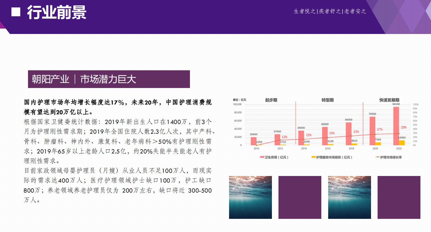 國(guó)內(nèi)護(hù)理市場(chǎng)年均增長(zhǎng)幅度達(dá)17%,未來(lái)20年,中國(guó)護(hù)理消費(fèi)規(guī) 模有望達(dá)到20萬(wàn)億以上。 根據(jù)國(guó)家衛(wèi)健委統(tǒng)計(jì)數(shù)據(jù):2019年新出生人口在1400萬(wàn),前3個(gè) 月為護(hù)理剛性需求期;2019年全國(guó)住院人數(shù)2.3億人次,其中產(chǎn)科、 骨科、腫瘤科、神內(nèi)外、康復(fù)科、老年病科>50%有護(hù)理剛性需 求;2019年65歲以上老齡人口2.5億,約20%失能半失能老人有護(hù) 理剛性需求。 目前家政領(lǐng)域母嬰護(hù)理員(月嫂)從業(yè)人員不足100萬(wàn)人,而現(xiàn)實(shí) 際的需求達(dá)400萬(wàn)人;醫(yī)療護(hù)理領(lǐng)域護(hù)士缺口100萬(wàn),護(hù)工缺口 800萬(wàn);養(yǎng)老領(lǐng)域養(yǎng)老護(hù)理員僅為 200萬(wàn)左右,缺口將近 300-500 萬(wàn)人